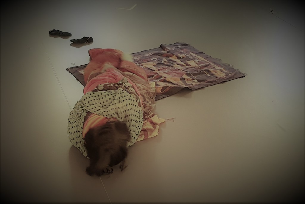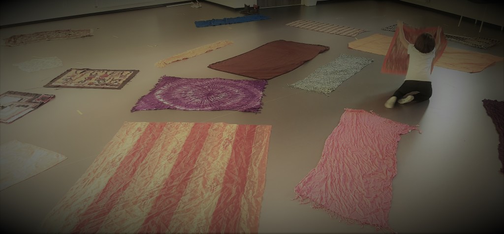 F. est sortie de son mutisme et me propose de rentrer dans son imaginaire. Elle a remplacé la parole par des rires et des formes corporelles et s’amuse à rassembler tous les tissus autour/sur/sous elle. Ses propositions dansées sont multiples, la musique nous entraîne et parfait cette bulle que F. vient de créer.