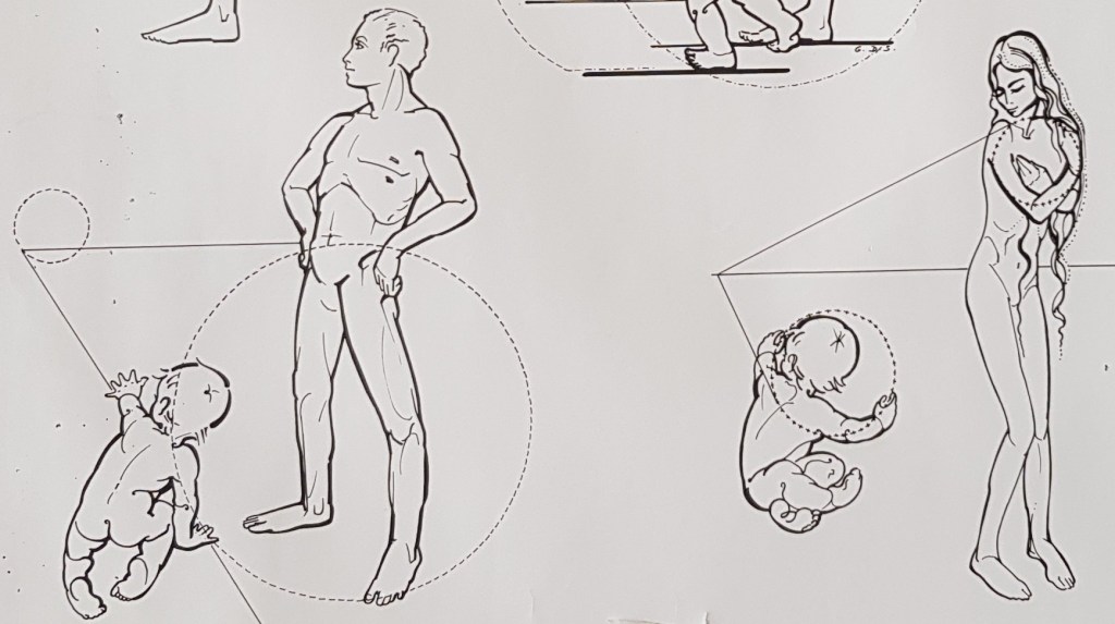 Au niveau musculaire, G. D. Struyf aborde le rassemblement et le déploiement à travers les chaînes musculaires antéro-latérales (AL) et postéro-latérales (PL). Les éveiller ensemble permet de les harmoniser et ainsi nous évite d’être en excès dans l’une ou l’autre. « C’est par elles que l’enfant unifie les hémi-espaces droit et gauche, préalable indispensable à la constitution de l’axe « , Benoît Lesage; et se sentir aligné à son axe nous procure ancrage et sécurité, gageures de nos engagements, justes.