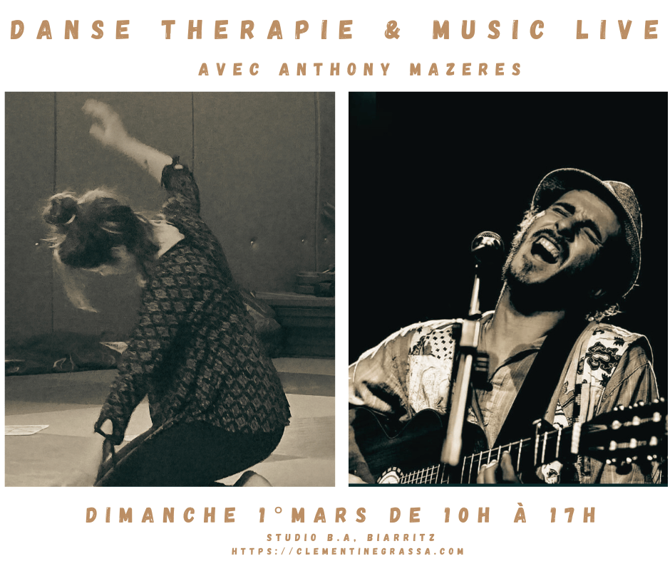 Entre découverte des fondamentaux de la danse thérapie et créativité infinie dans la libre expression du soi, les ateliers sur une journée nous permettent de prendre le temps et de choisir une direction juste pour le groupe. L’après midi, je suis très heureuse d’accueillir Anthony Mazeres, musicien aux voix et univers multiples, pour nous accompagner dans l’exploration de nos mouvements libérés grâce au travail psycho-corporel du matin.