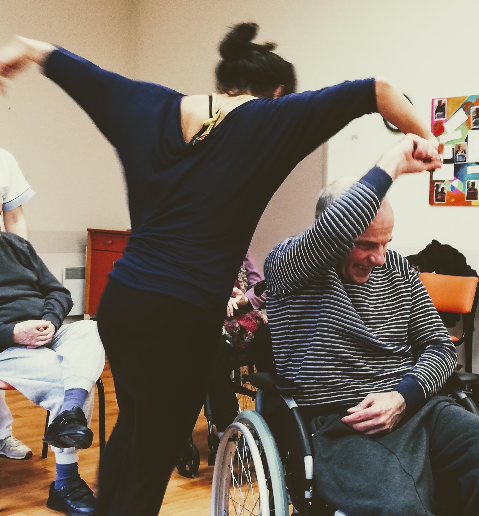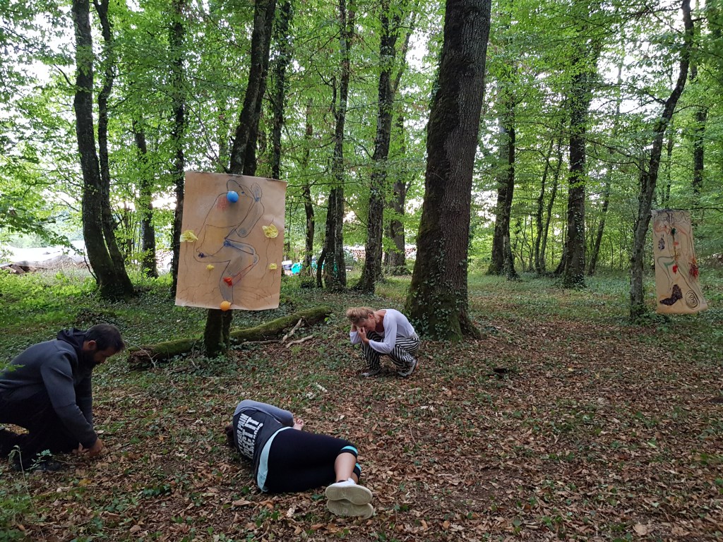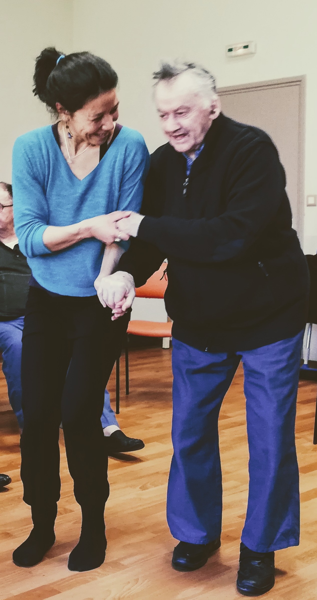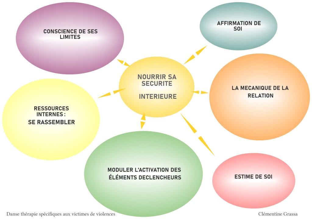 La danse thérapie est au cœur des accompagnements et s’accepte comme une expérience réparatrice. Dans les deux structures, cet accompagnement centré sur le corps est spécifique aux victimes de violences et/ou en état de stress post traumatique (ESPT) mais aussi auprès des personnes souffrants de Trouble de la conduite alimentaire (TCA). Ce sont des groupes fermés qui bénéficient de deux séances hebdomadaires pendant 10 semaines. Une séance de 2H avec des échanges et de la psychoéducation animée par un psychiatre et une psychologue; et une autre de 2H également autour du Corps en mouvement avec une infirmière psy ou psychologue et moi même.