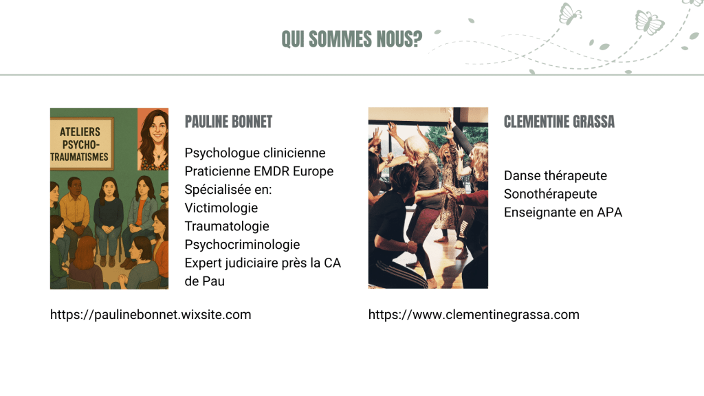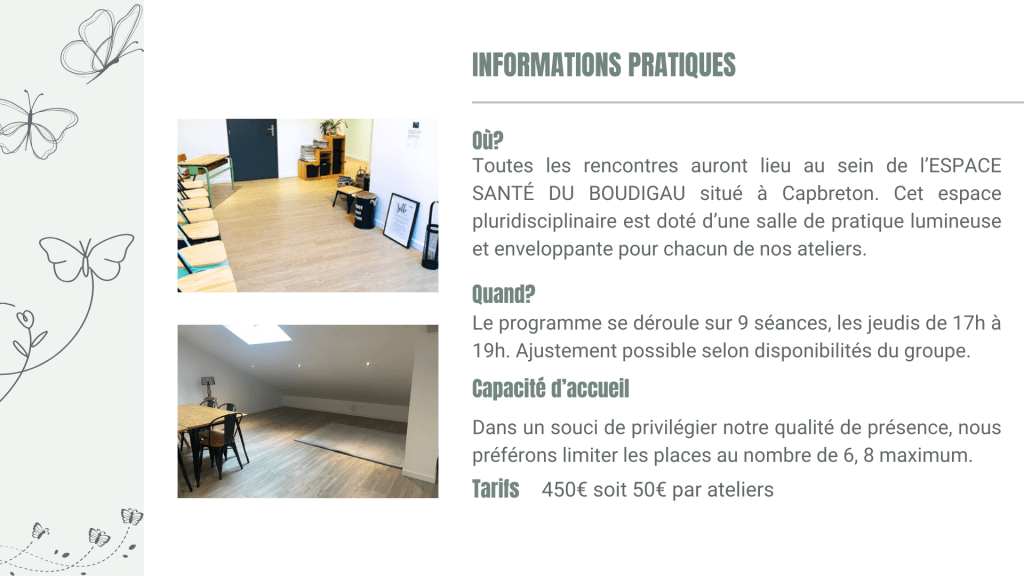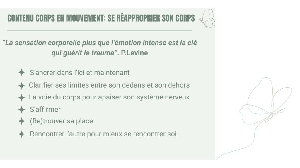 Programme d’accompagnement (faire défiler le diaporama): Groupe continu sur 9 séances de 2h où groupe de parole et corps en mouvement se croiseront.