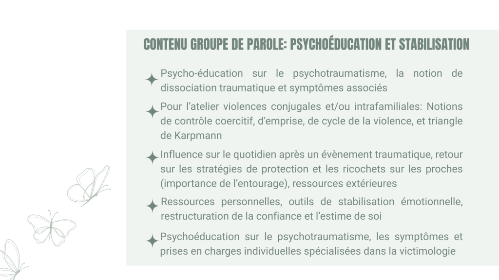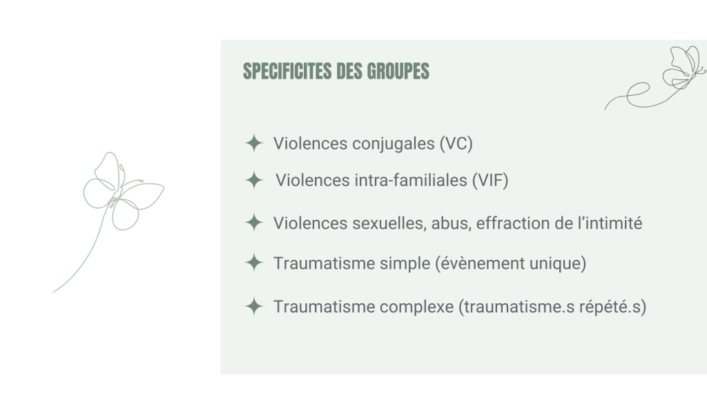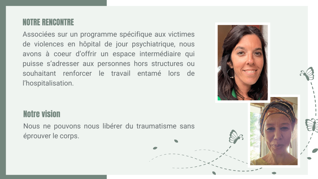 Associées sur un programme spécifique aux victimes de violences en hôpital de jour psychiatrique, nous avons à cœur d’offrir un espace intermédiaire qui puisse s’adresser aux personnes hors structures ou souhaitant renforcer le travail entamé lors de l’hospitalisation.