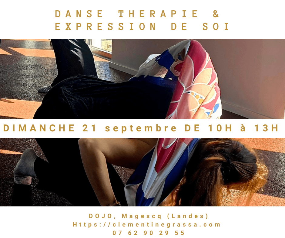 De 10h à 13h au DOJO, Magescq (Complet) Entre découverte des fondamentaux de la danse thérapie et créativité infinie dans la libre expression du soi. Confessions…. Effectivement, je fais le choix de ne pas vous informer du thème abordé; Ma principale motivation est de préserver une qualité d’écoute à ce qui doit être dans leLire la suite « Danse thérapie et expression de soi Dimanche 21 septembre »