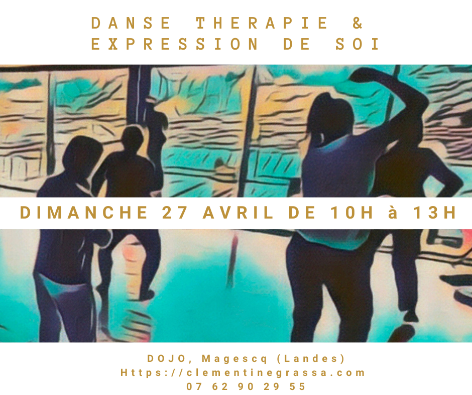 Dojo, Magescq (40140) Entre découverte des fondamentaux de la danse thérapie et créativité infinie dans la libre expression du soi. Confessions…. Effectivement, je fais le choix de ne pas vous informer du thème abordé; Ma principale motivation est de préserver une qualité d’écoute à ce qui doit être dans le moment présent. C’est aussi accueillirLire la suite « Danse thérapie et expression de soi Dimanche 27 avril de 10H à 13H »